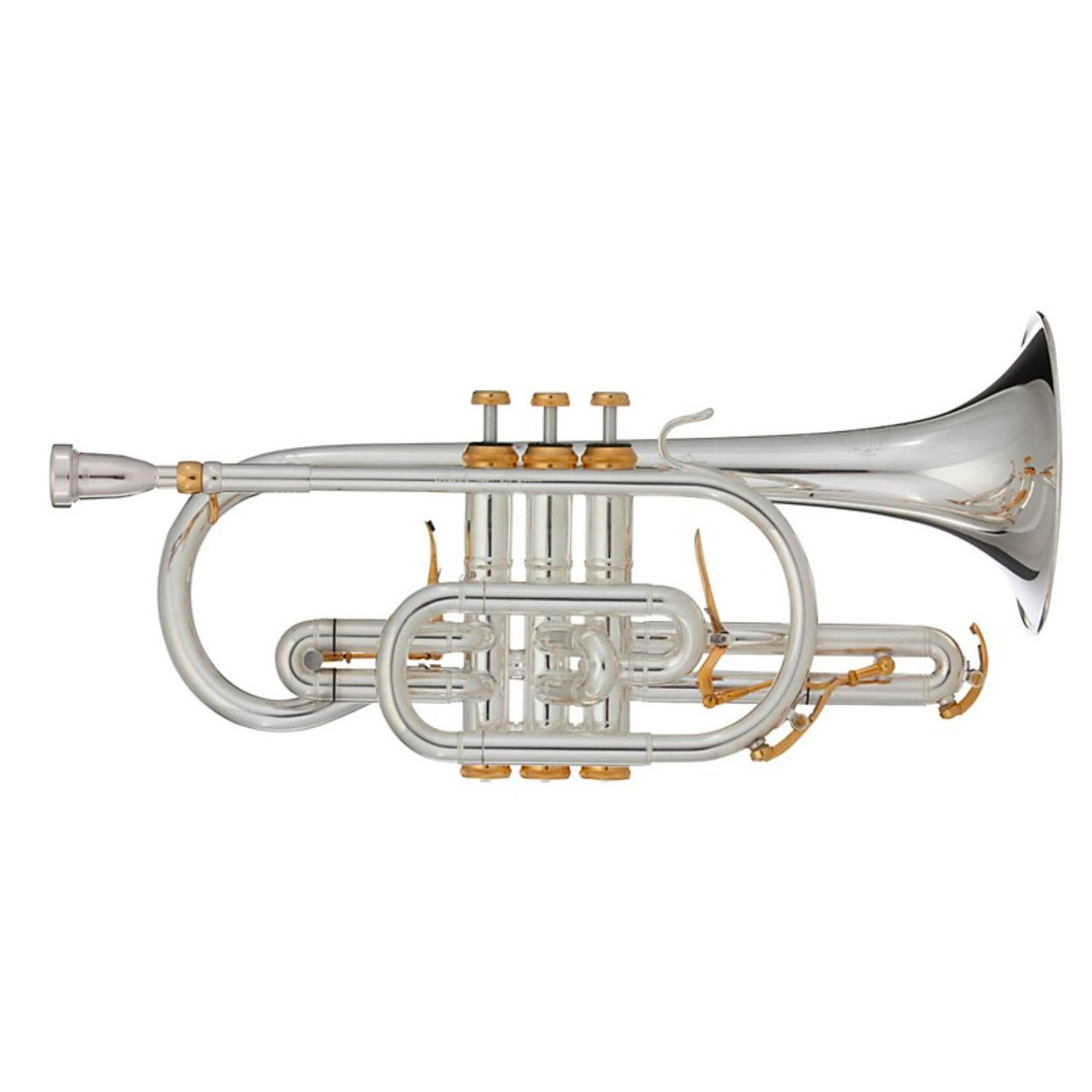 Features : Shepherd's Crook, 1st and 3rd slide triggers, dual exchangeable mouthpiece receiver (cornet/trumpet), gold plated top/bottom caps, finger buttons, water keys, and triggers, quiet felt valve cap in-lays, o-ring dampeners for 1st/3rd slides.